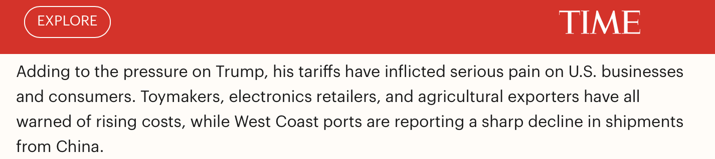 报道同时指出,美国政府的关税措施给美国企业和消费者带来了沉重打击,这进一步加剧了美国政府的压力。玩具制造商、电子产品零售商和农产品出口商都警告称,成本将上升,而美国西海岸的港口则报告称,来自中国的货运量急剧下降。