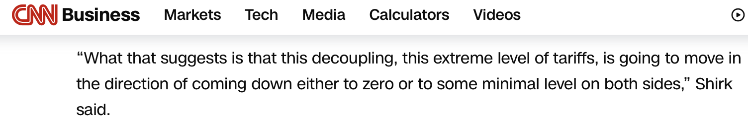 美国有线电视新闻网的报道注意到美国财政部长贝森特此前关于“本周末的谈判将侧重于缓和紧张局势”的表态。报道援引加州大学圣迭戈分校全球政策与战略学院研究教授、21世纪中国研究中心名誉主任苏珊·希尔克的观点指出,这表明美中之间“脱钩、极端的关税水平,将朝着降至零,或是降至最低水平的方向发展”。