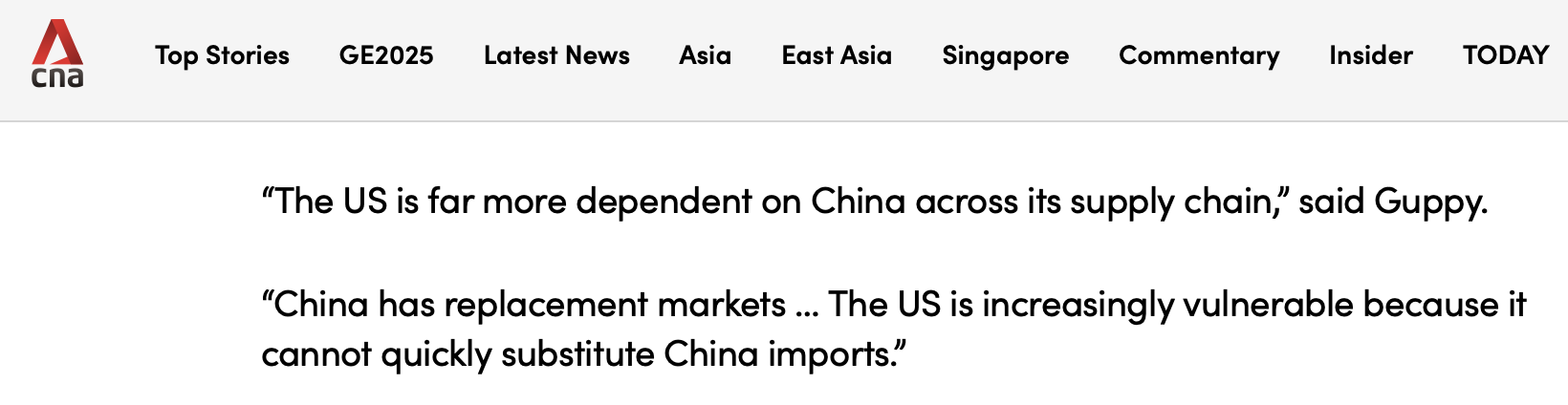 报道称,澳大利亚金融专栏作家戴若·顾比表示,“美国整个供应链对中国的依赖程度要高得多”,“中国有替代市场……美国则越来越脆弱,因为它无法迅速找到中国进口产品的替代品”。