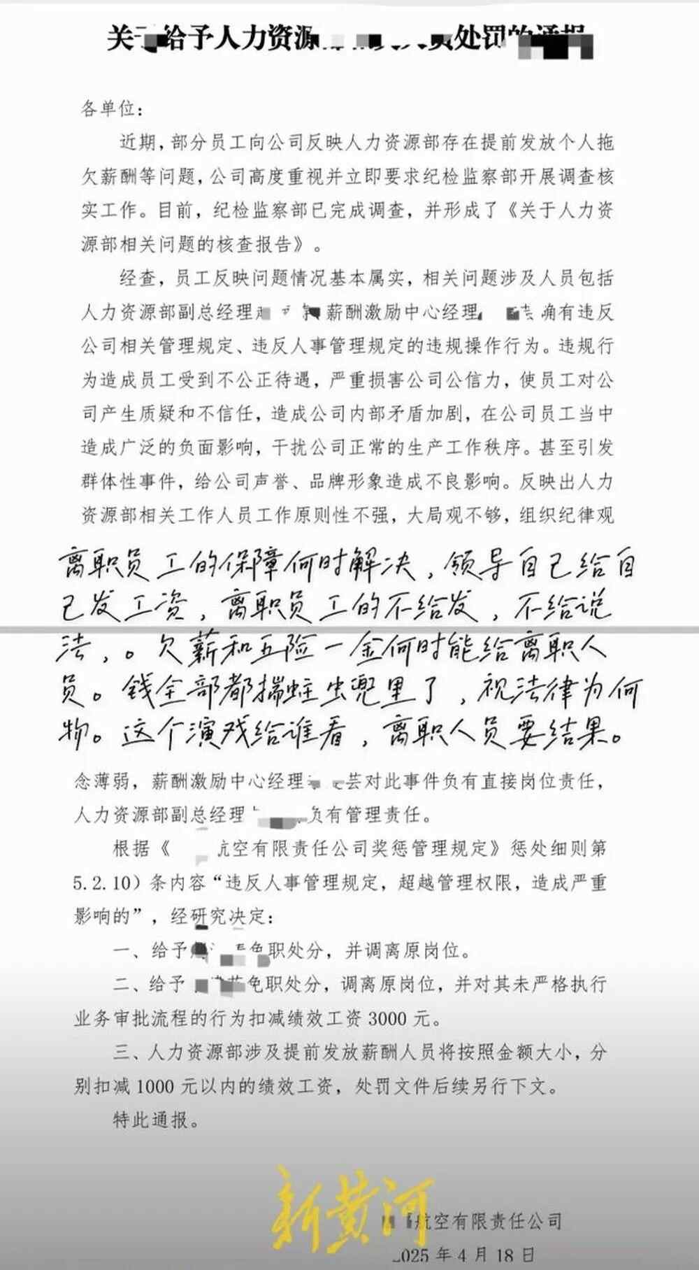 在社交平台上,一名员工晒出的处罚通报显示:经查,员工反映问题情况基本属实,相关问题涉及人员包括人力资源部副总经理xxx、薪酬激励中心经理xxx确有违反公司相关管理规定、违反人事管理规定的违规操作行为。违规行为造成员工受到不公正待遇,严重损害公司公信力,使员工对公司产生质疑和不信任,造成公司内部矛盾加剧,在公司员工当中造成广泛的负面影响,干扰公司正常的生产工作秩序,甚至引发群体性事件,给公司声誉、品牌形象造成不良影响。两人均被免职,并调离原岗位,其中扣除薪酬激励中心经理绩效3000元。
