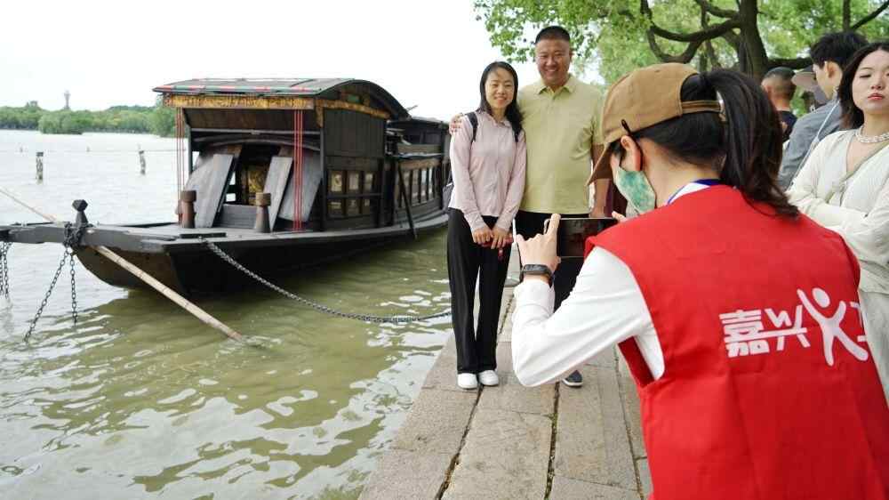 5月4日,在浙江省嘉兴市南湖景区湖心岛,嘉兴义工协会义工为游客提供拍照服务。新华社发(金鹏摄)