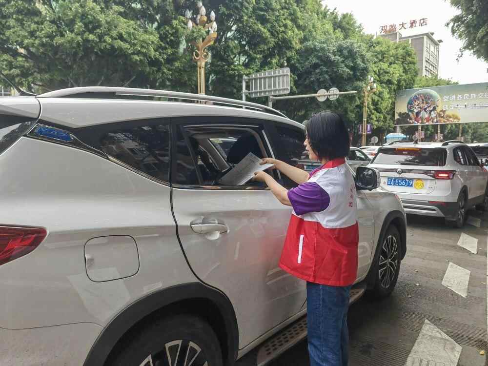 5月2日,云南省墨江哈尼族自治县一名志愿者向游客发放节庆活动行程单。(墨江县融媒体中心供图)