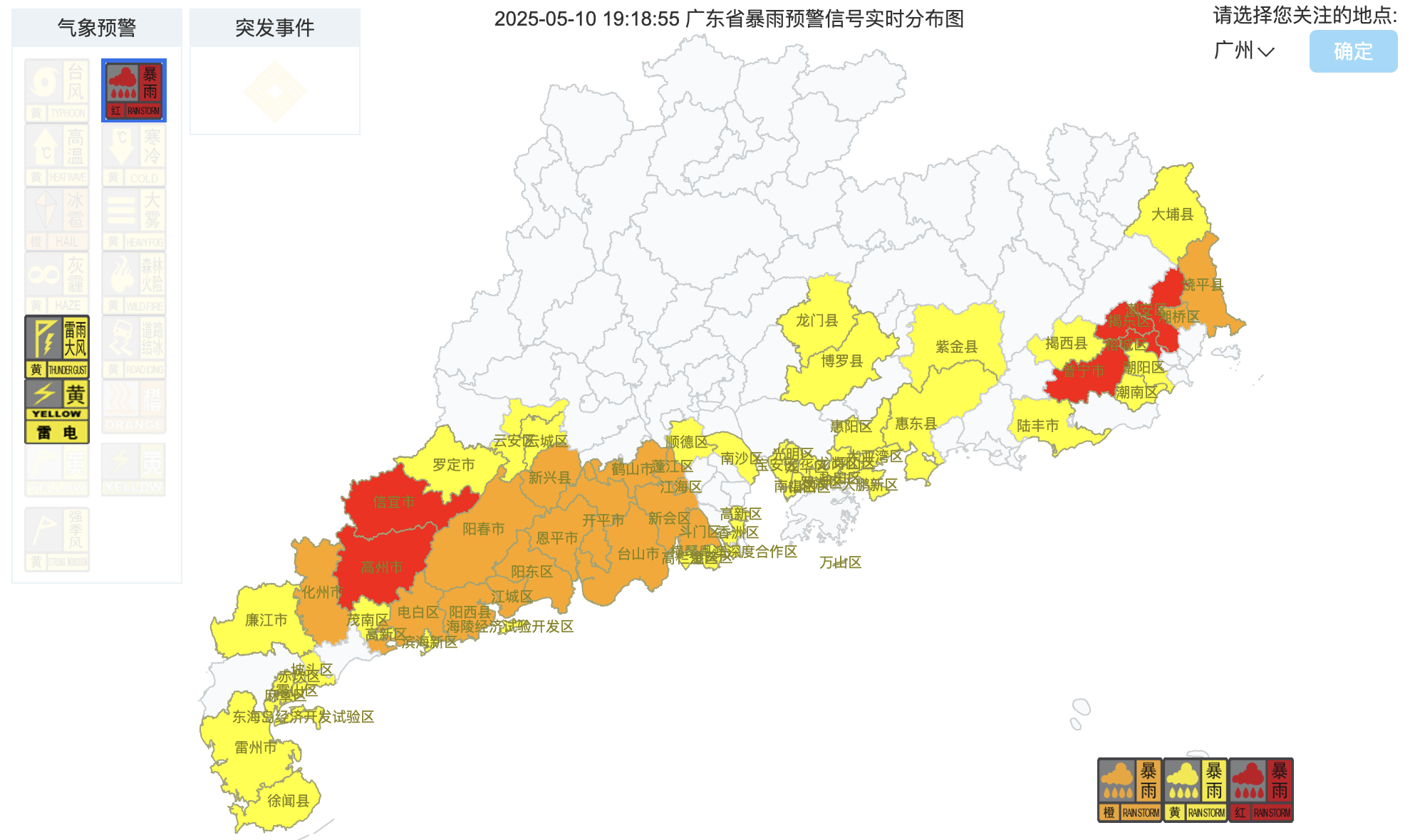根据广东省气象部门观测,截至5月10日傍晚,广东多地仍受强降水影响。根据广州天气网广东省内城市预警实况,截至10日19时18分,茂名、揭阳、潮州等市,存在暴雨预警最高等级红色区域;云浮、阳江、江门、珠海等市,存在暴雨预警最高等级橙色区域;湛江、佛山、广州、深圳、惠州、河源、汕尾、汕头等市,存在暴雨预警最高等级黄色区域。