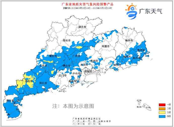 广东省气象部门5月10日提醒,降水虽预计减弱,但防灾减灾意识不能降低。根据广东省地质灾害风险预报,预计至11日中午,茂名市电白区大部、高州市大部、化州市大部、信宜市大部,肇庆市德庆县南部、四会市南部、西部,清远市清城区南部、佛冈县中部、东部等地,地质灾害气象风险等级四级,云浮市新兴县中部、罗定市南部、北部部分区域地质灾害气象风险预警等级三级。