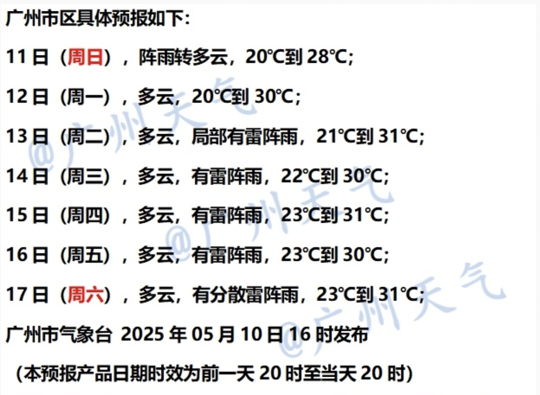 广州市气象台5月10日预计,伴随切变线南压,广州将在10日夜间至11日逐渐由阵雨转多云天气,12日至13日以多云为主,其中13日起至18日局部有雷阵雨。