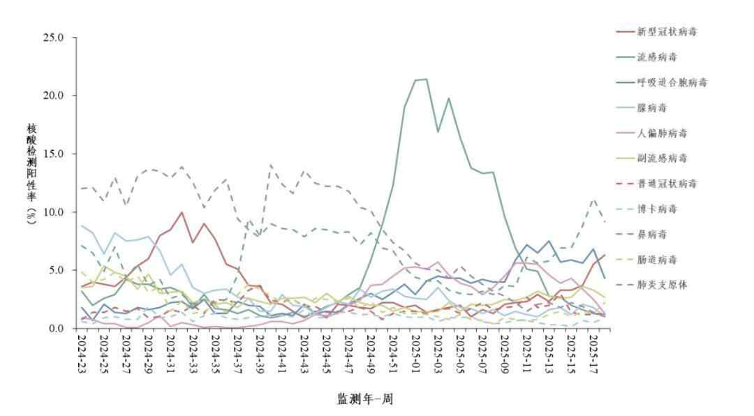 全国急性呼吸道传染病哨点监测情况(2025年4月,第14周—18周)图源:中国疾病预防控制中心官网