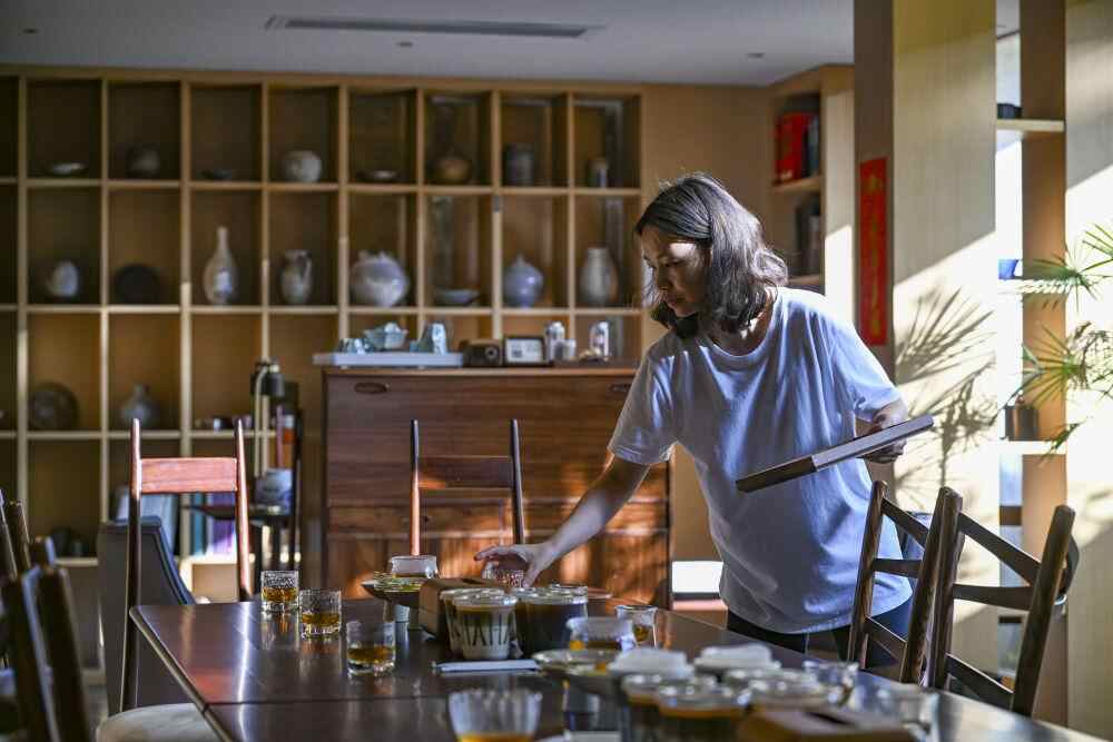 工作人员在长守戏剧谷内一家咖啡厅内布置