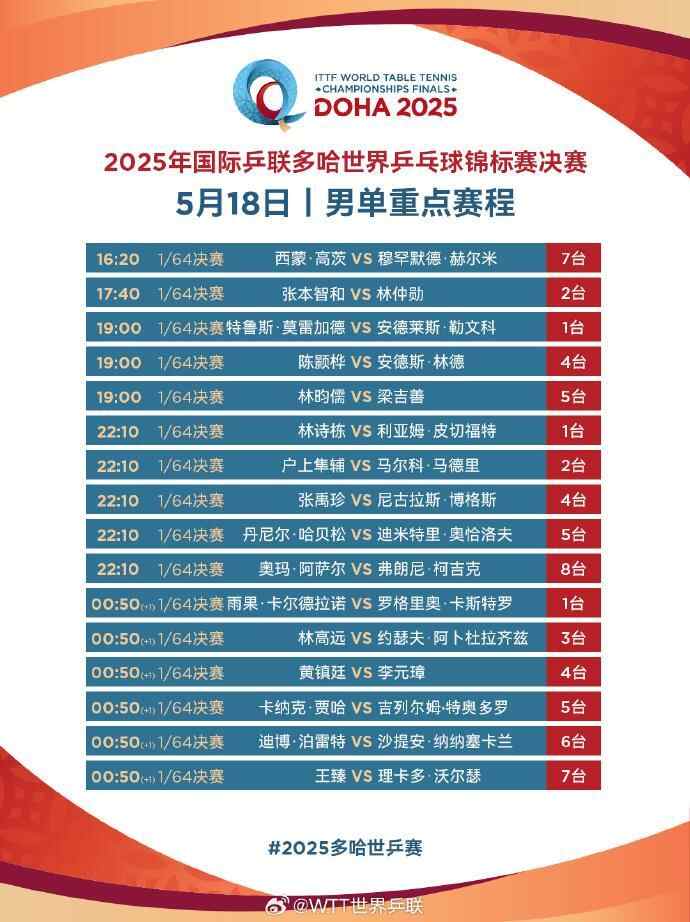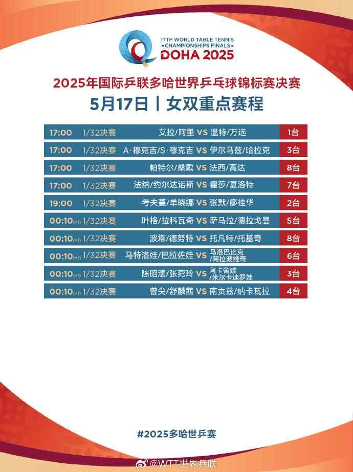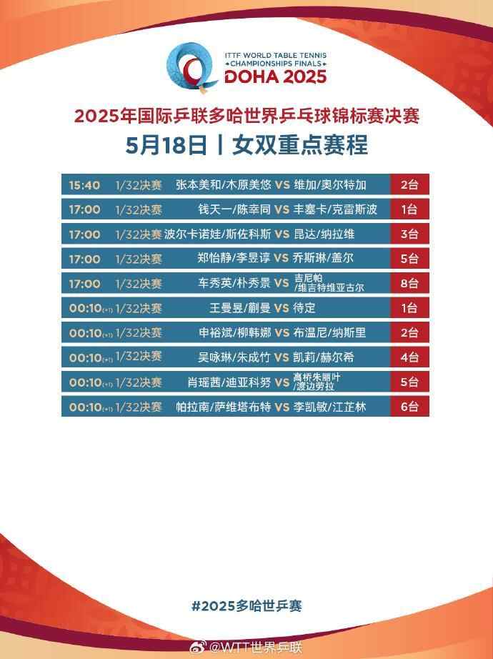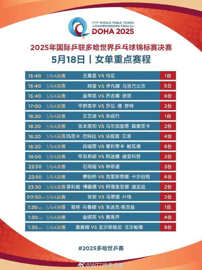 北京时间今天下午多哈世乒赛将火热开打!