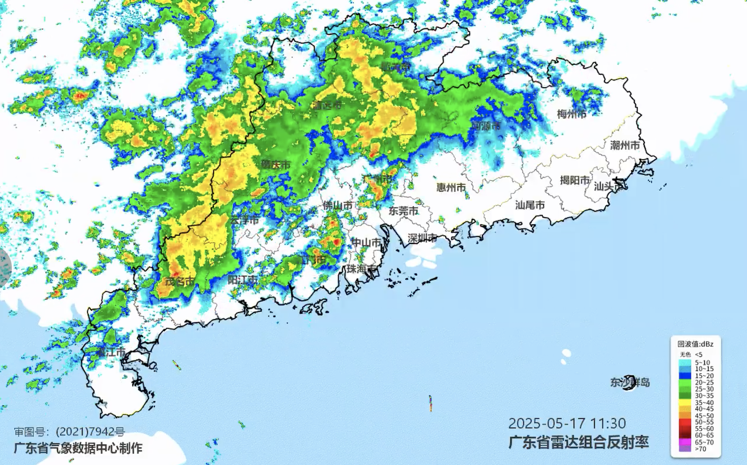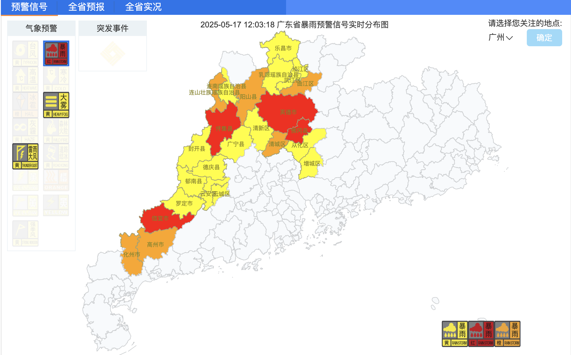 5月17日上午11时许,@广东天气发布的雷达图显示,大半个广东都泡在水里。其中,英德、信宜等地发布了暴雨红色预警信号。