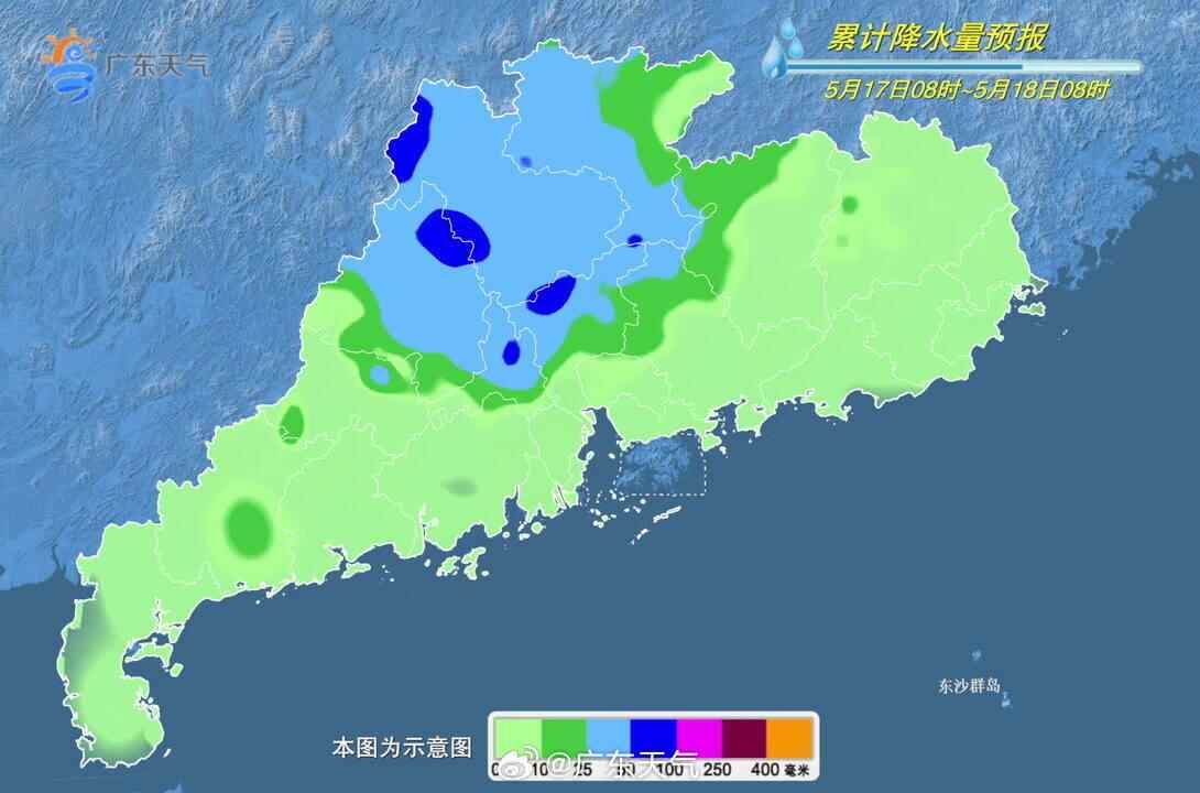 预计今天(17日),韶关、清远、珠江三角洲中北部市县多云到阴天,有中到大雨,局部暴雨或大暴雨,其余市县多云间阴天,有(雷)阵雨,局部大雨。