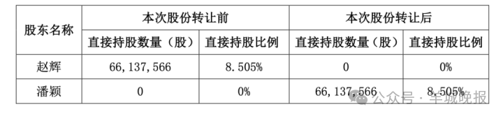 公告显示,公司于近日收到实际控制人之一赵辉的通知,赵辉已收到《证券过户登记确认书》,其已将直接持有的公司6613.76万股股份(占公司总股本的8.505%)通过证券非交易过户的方式过户登记至潘颖名下,相关手续已办理完毕。