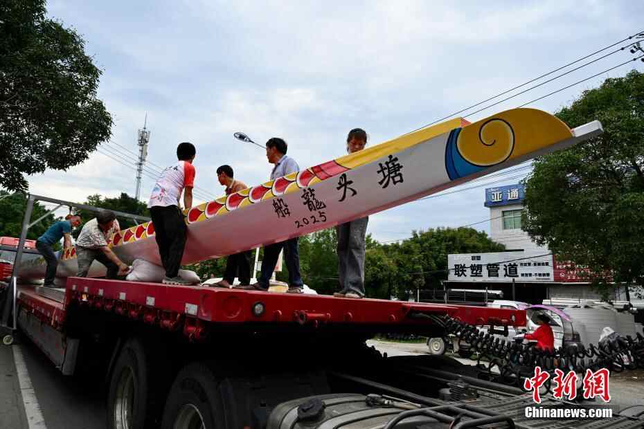 5月16日,端午节临近,在福建省福州市闽侯县南通镇方庄村里,各家龙舟加工厂正忙着赶制端午节的龙舟订单。方庄村是福建远近闻名的“龙舟村”,制造龙舟的技艺已传承了700多年,每年有200余艘传统龙舟销往全国及海外。图为工人将销往外省的龙舟进行装车。