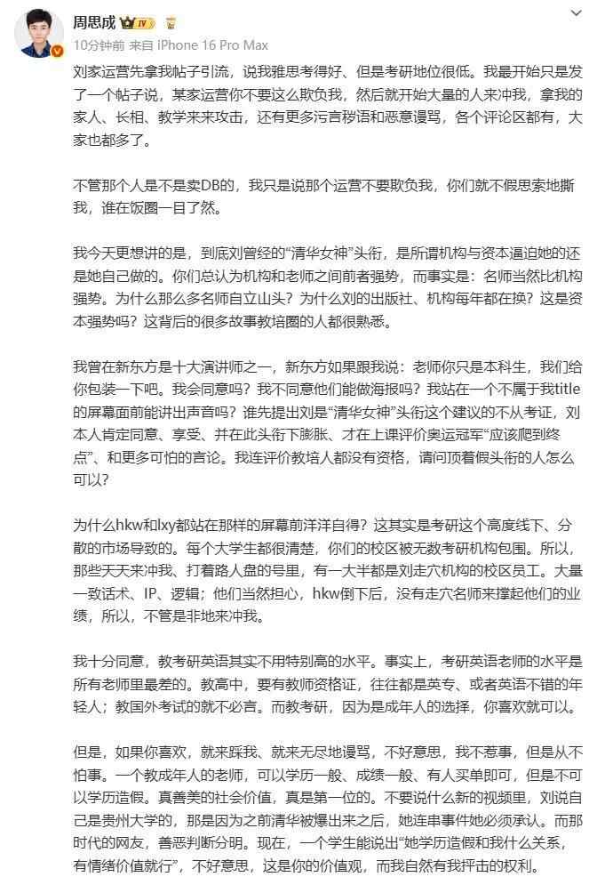 近日,知名考研英语讲师周思成质疑同行刘晓艳英语水平差、编假学历等引发关注。