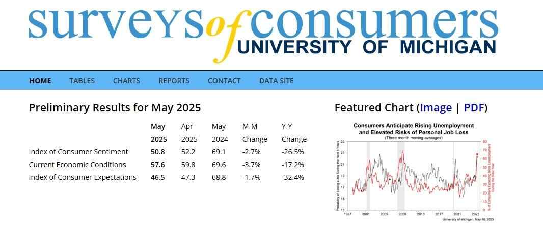 △2015年5月至2025年5月,美国消费者信心指数。图片来源:美国密歇根大学