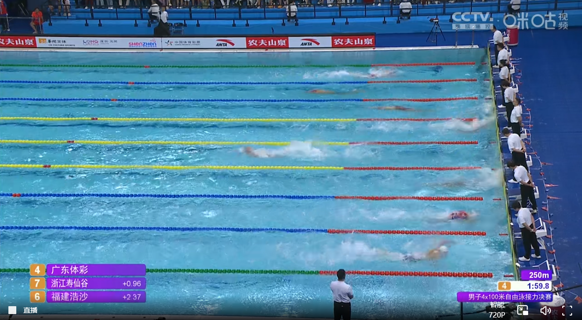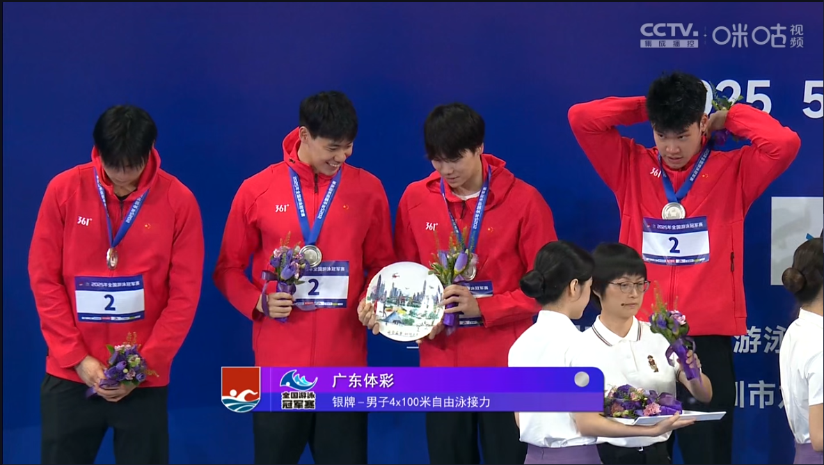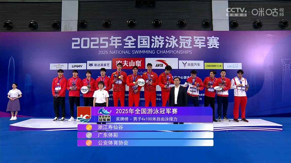在5月17日晚举行的全国游泳冠军赛男子4x100米接力决赛中,浙江寿仙谷凭借着潘展乐最后一棒的反超获得冠军,刷新赛会纪录。广东体彩获得亚军,在被反超之前保持着长时间的领先位置。