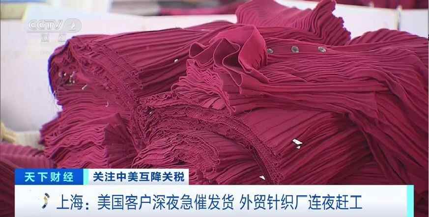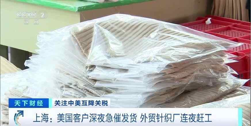 在中美大幅互降关税后,位于上海松江区李塔汇镇的一家针织厂,接到了美国客户可以出货的通知。已经在包装车间里堆了1个月的50000多件成衣,终于可以开启最后的工序,车间内的工人全员上岗,缝商标、熨烫、打吊牌,各个工序有条不紊。