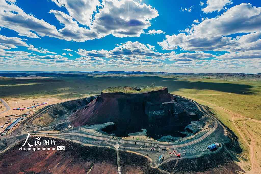 2025年5月14日,内蒙古自治区乌兰察布市察哈尔右翼后旗的乌兰哈达火山群与广袤草原相映成景。王晓博摄(人民图片网)