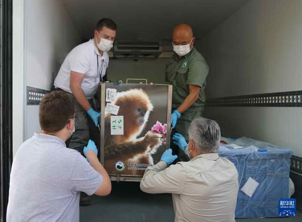 5月14日,在比利时布鲁塞尔机场,工作人员转运金丝猴。