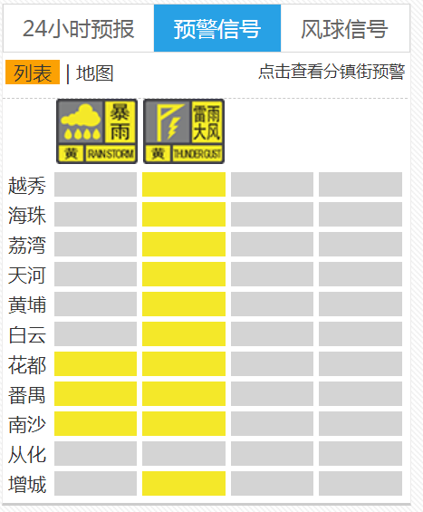 截至16日13时16分,除从化外,广州其余各区均已发布雷雨大风黄色预警信号,花都、南沙、番禺同时发布暴雨黄色预警信号,请市民注意防御。