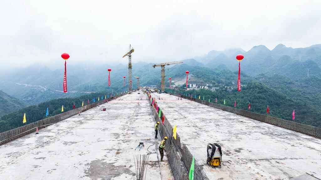 5月15日,工人在纳晴高速六枝特大桥上进行施工(无人机照片)。