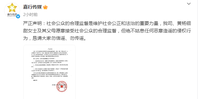5月16日中午,女演员黄杨钿甜经纪公司嘉行传媒发布一则严正声明:社会公众的合理监督是维护社会公正和法治的重要力量,我司、黄杨钿甜女士及其父母愿意接受社会公众的合理监督,但绝不姑息任何恶意造谣的侵权行为,恳请大家勿信谣、勿传谣。