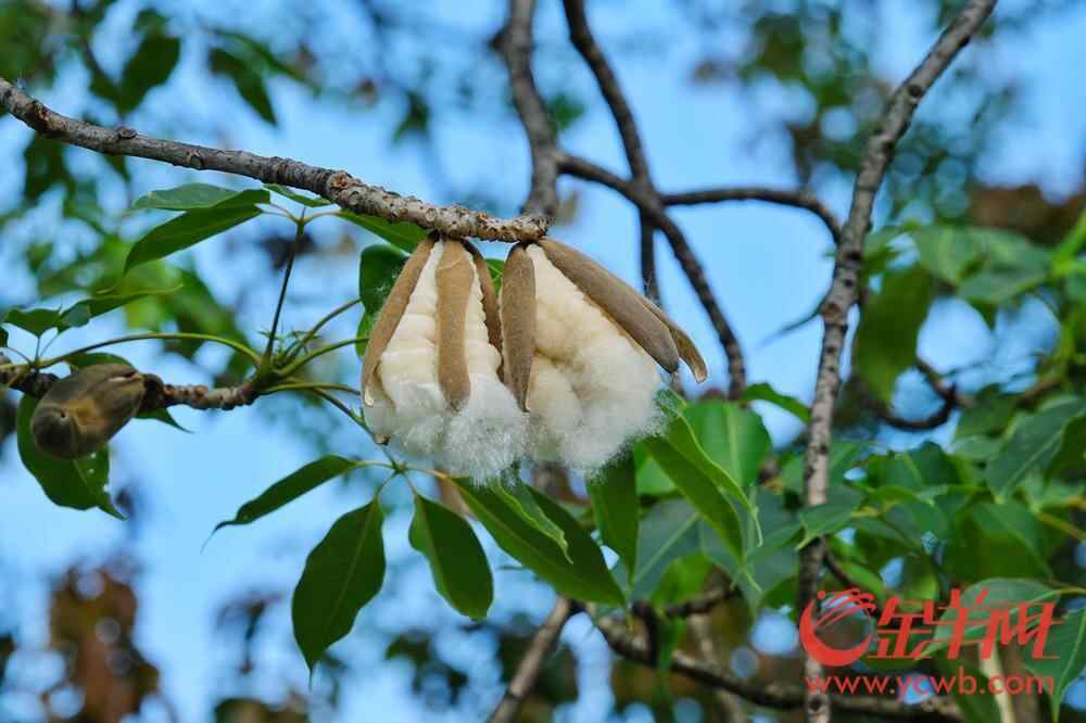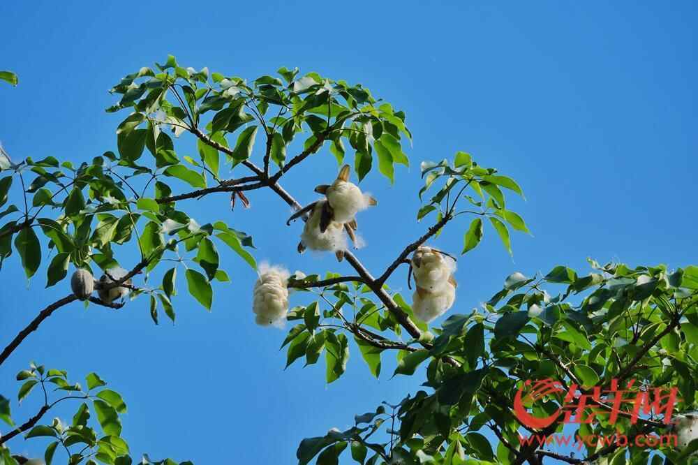 这两天,在荔湾湖公园海山仙馆附近,湖边木棉树顶爆出朵朵白絮,蓝天下如飞雪随风漫舞,与湖中初绽的新荷构成一幅动静相宜的水墨丹青。