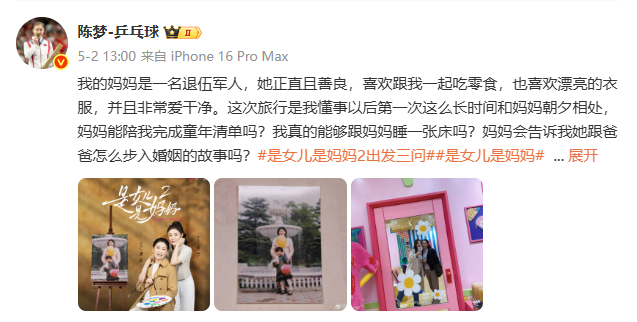 5月2日,奥运冠军陈梦官宣加入综艺节目《是女儿是妈妈2》,并自曝“妈妈是一名退伍军人”。