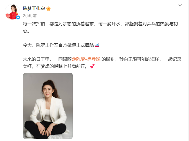 5月16日,@陈梦工作室 发文:每一次挥拍,都是对梦想的执着追求,每一滴汗水,都凝聚着对乒乓的热爱与初心。今天,陈梦工作室官方微博正式启航。该账号还@了陈梦的微博账号。