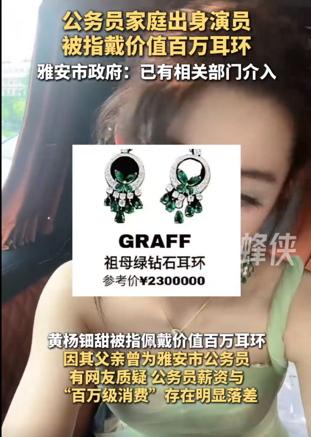 连日来,演员黄杨钿甜佩戴价值230万耳环的消息在网络上传播,引发关注。5月14日下午,多个消息称,黄杨钿甜父亲为四川雅安公务员,质疑其高额消费不合理。