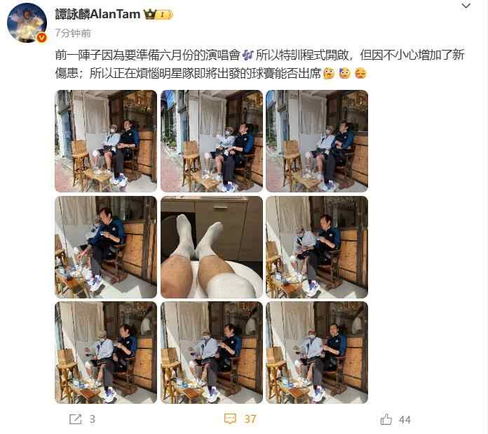 谭咏麟表示:“前一阵子因为要准备六月份的演唱会,所以特训程序开启,但因不小心增加了新伤患;所以正在烦恼明星队即将出发的球赛能否出席。”