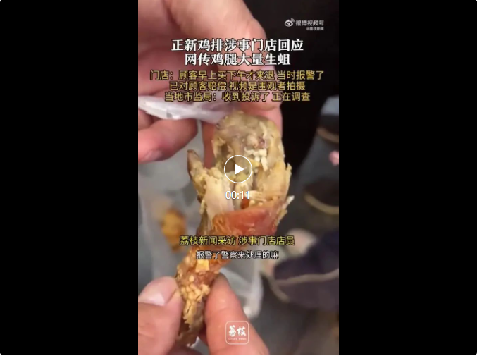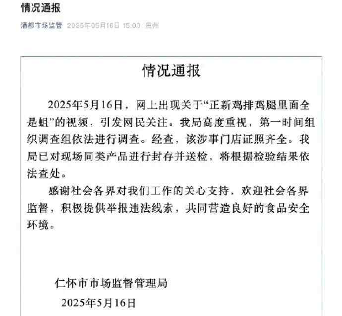 2025年5月16日,网上出现关于“正新鸡排鸡腿里面全是蛆”的视频,引发网民关注。我局高度重视,第一时间组织调查组依法进行调查。经查,该涉事门店证照齐全。我局已对现场同类产品进行封存并送检,将根据检验结果依法查处。