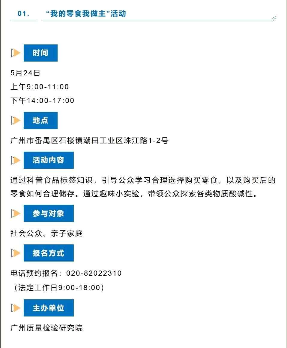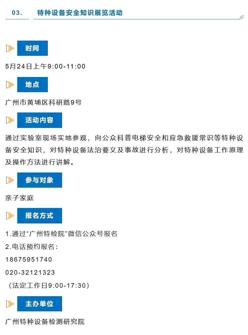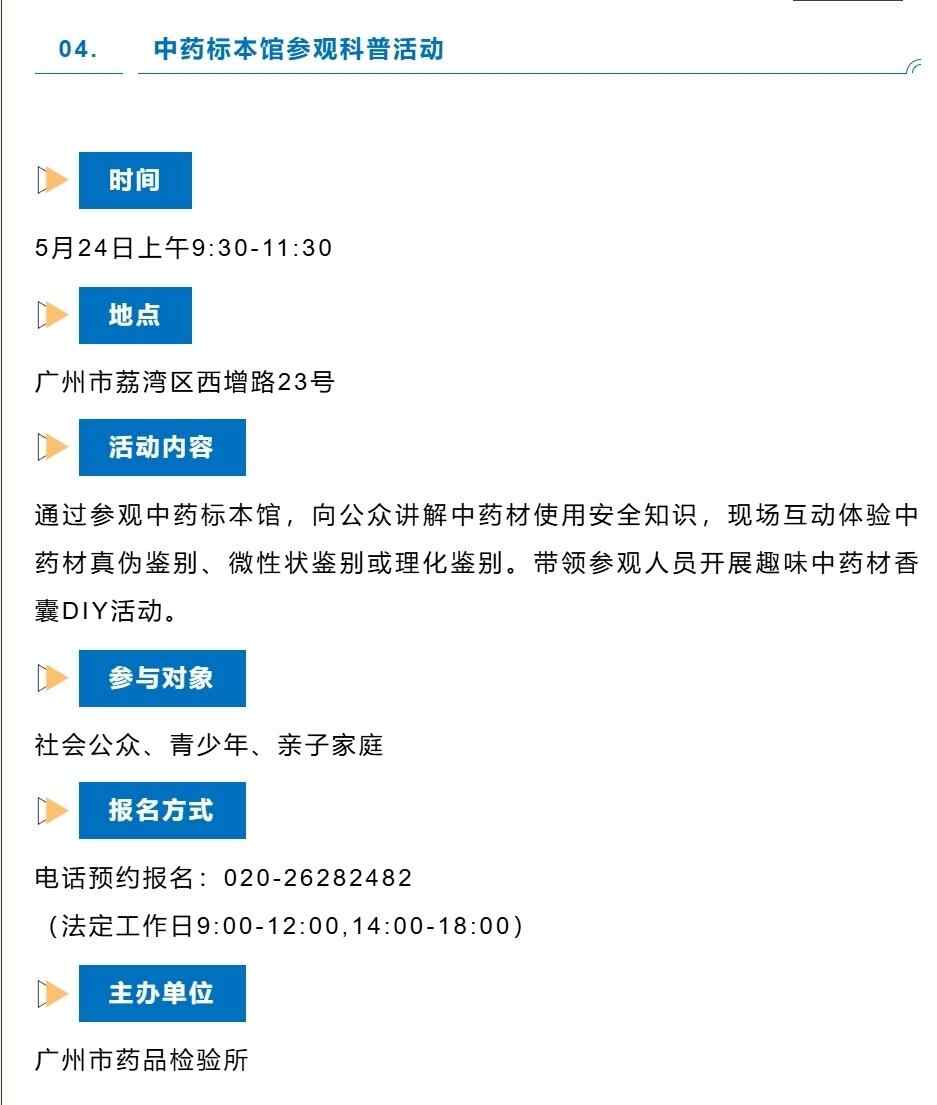 看懂食品标签、参加电梯应急演练、参观中药标本馆……由广州市市场监管局举办的2025年科技活动周科普宣传活动已开始报名!想近距离了解这些“身边事”的市民朋友不要错过。记者了解到,多个活动适合亲子家庭。报名截止时间为5月22日,参观时间5月24日(星期六)至5月31日(星期六)。免费参观,名额有限,有意参加的市民朋友可抓紧报名。