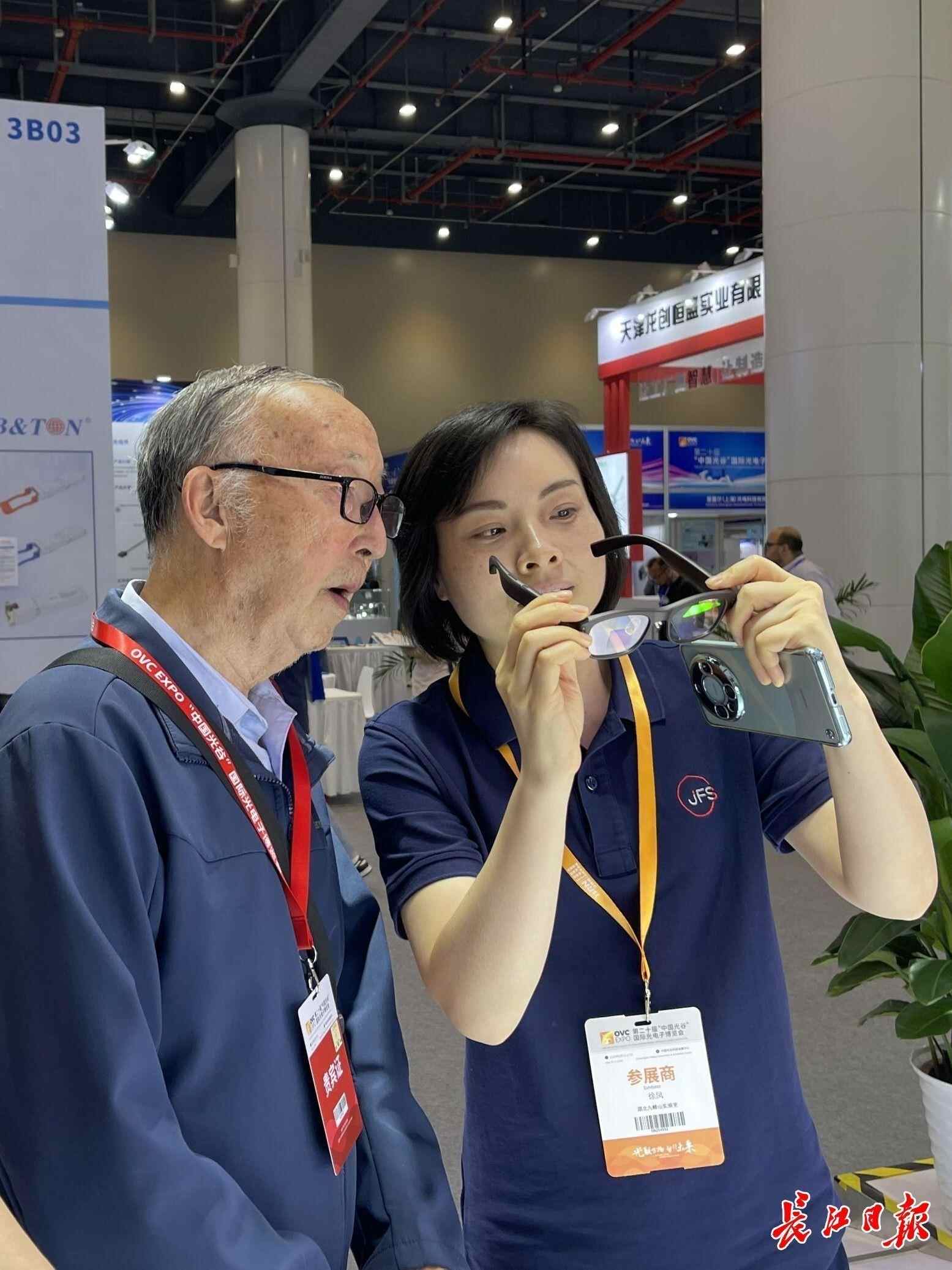 第二十届光博会九峰山实验室展位,搭载氮化镓芯片的AI眼镜引起了殷鸿福院士(左二)的注意。记者李佳 摄