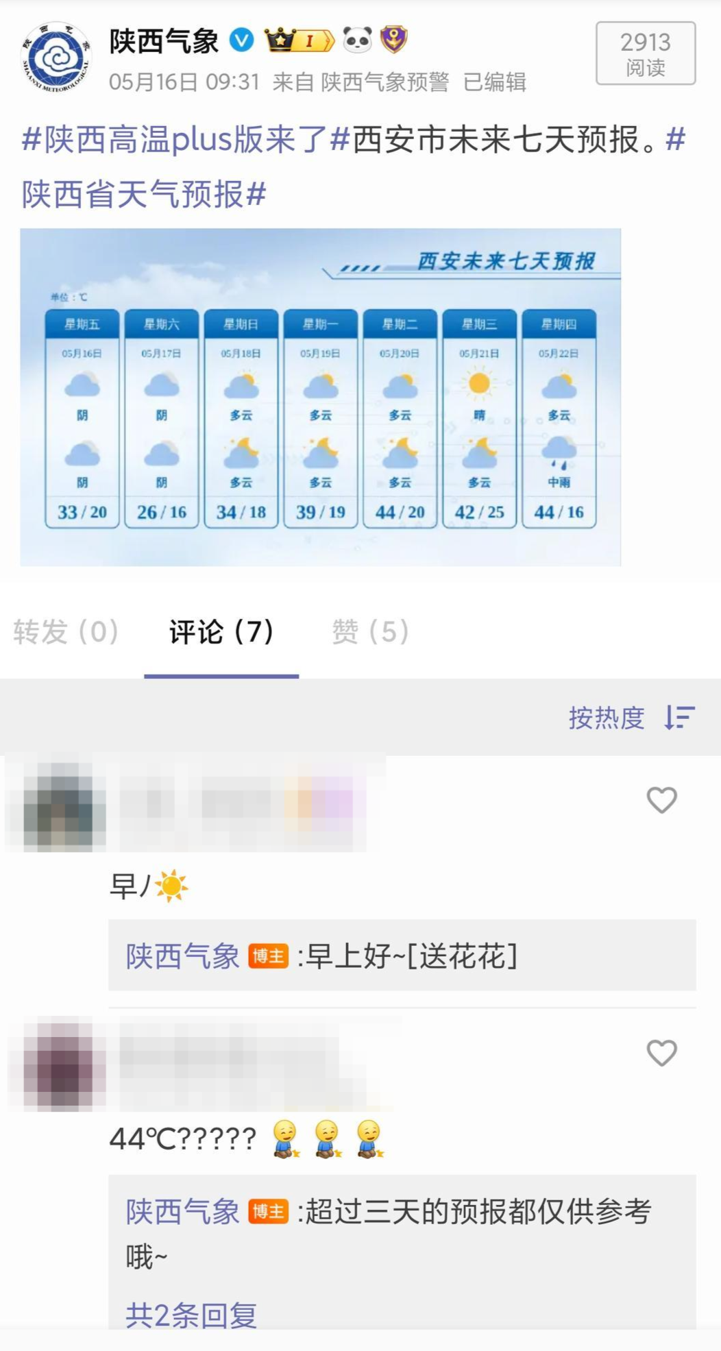 近日,“西安下周最高温将迎来44℃”的消息在当地网友间传开。根据陕西气象官方微博16日上午发布的未来七天预报,5月20日西安气温预计为20-44℃,22日气温预计为16-44℃。