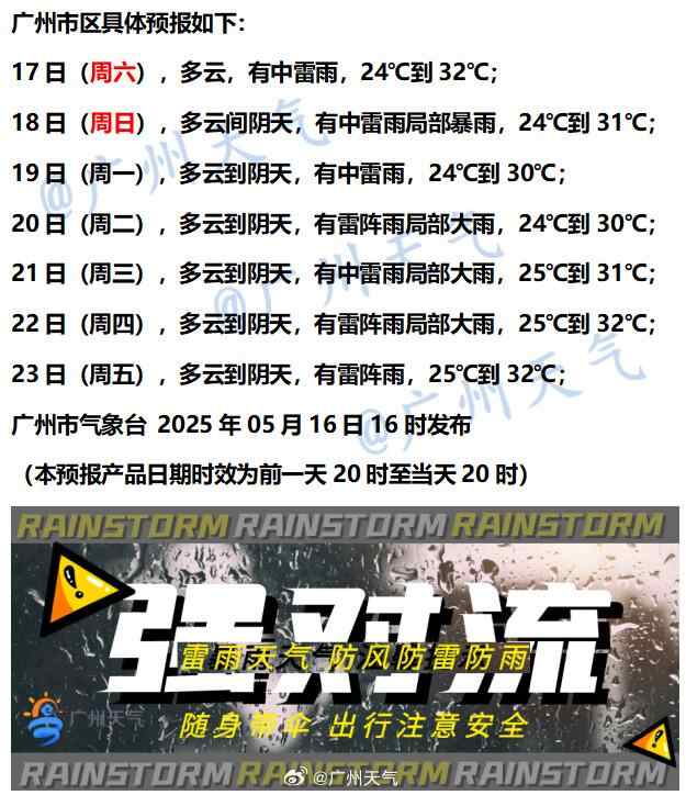 @广州天气预计,今明两天雷雨密集到访,午后时段雷雨尤其活跃,展望下周仍是雷雨刷屏。