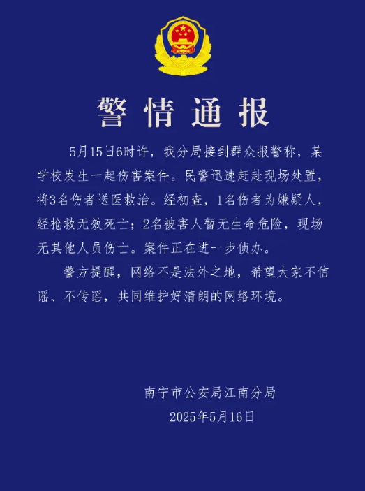 5月15日6时许,我分局接到群众报警称,某学校发生一起伤害案件。民警迅速赶赴现场处置,将3名伤者送医救治。经初查,1名伤者为嫌疑人,经抢救无效死亡;2名被害人暂无生命危险,现场无其他人员伤亡。案件正在进一步侦办。警方提醒,网络不是法外之地,希望大家不信谣、不传谣,共同维护好清朗的网络环境。
