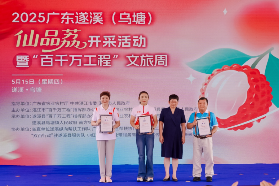 为了进一步提升“仙品荔”的品牌影响力,活动现场授予世界女子双人技巧冠军李小燕、羽毛球世界冠军吴迪西、举重世界冠军何灼强“遂溪乌塘仙品荔公益推广大使”称号,授予中国太平洋财产保险股份有限公司广东分公司三农部/助力乡村振兴办公室总经理黄途倩“遂溪乌塘仙品荔保驾护航大使”称号。