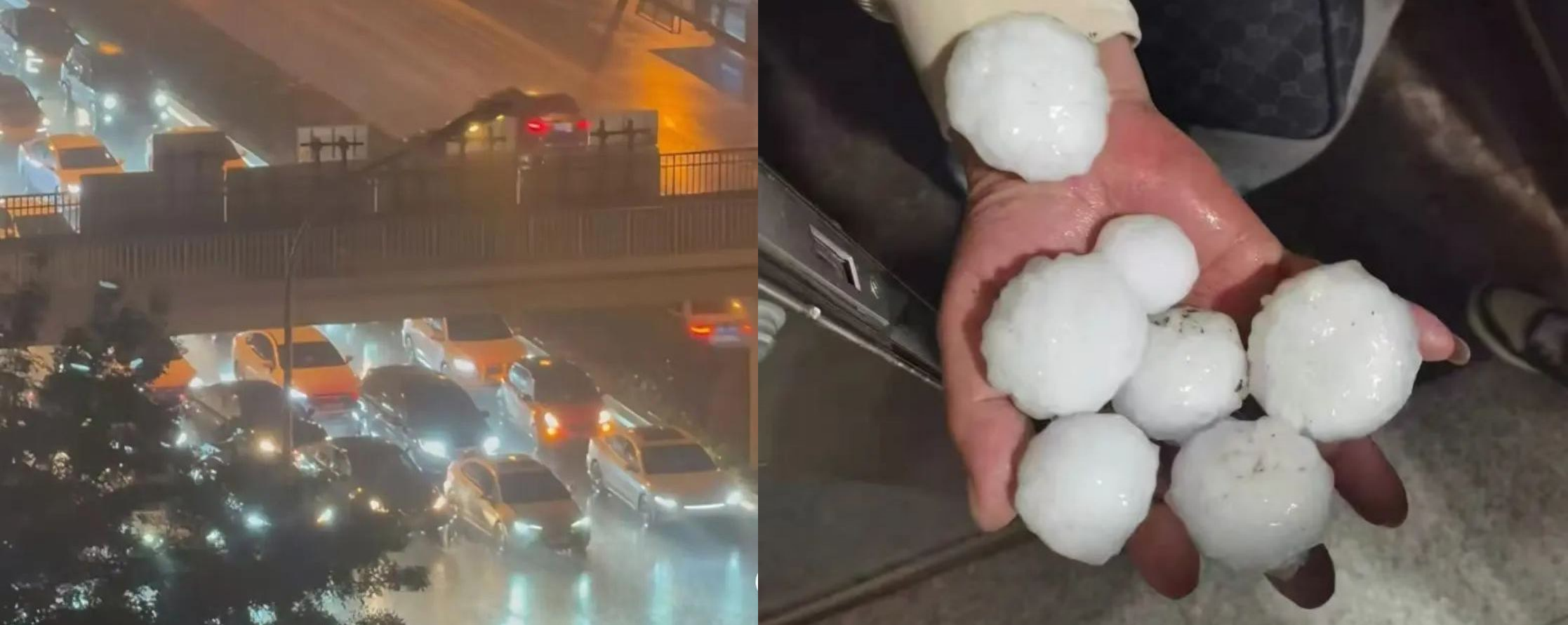 有车辆为躲避冰雹滞留在天桥下