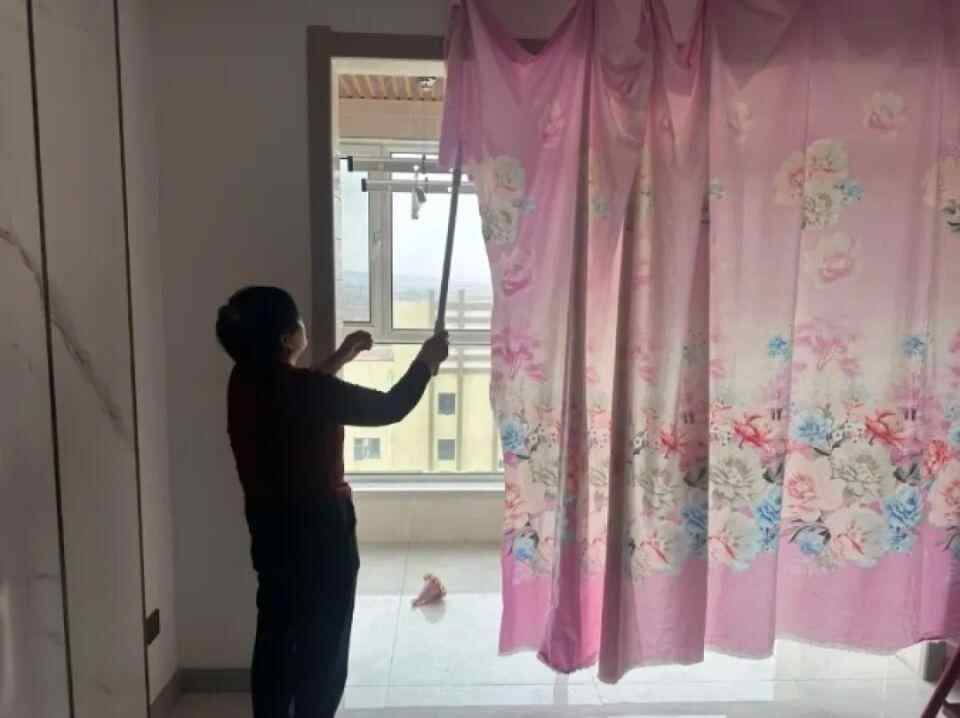 涉案房屋内被点燃的窗帘,烧损处已被男方母亲裁下丢弃