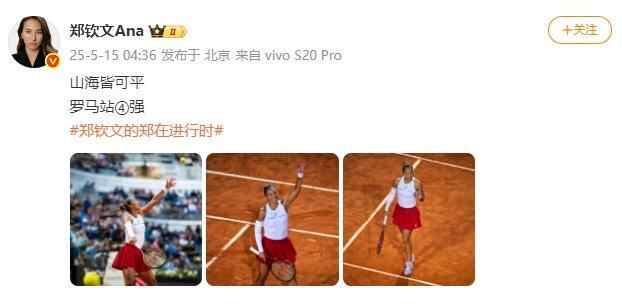 赛后,郑钦文也在社交平台发文:“山海皆可平 罗马站④强”