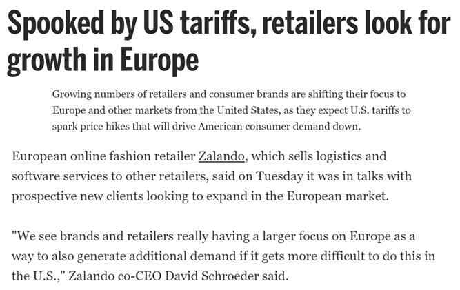 与此同时,由于预计关税将引发价格上涨、压低美国消费需求,越来越多的欧洲零售商和消费品牌也在将重心从美国转向欧洲和其他市场。