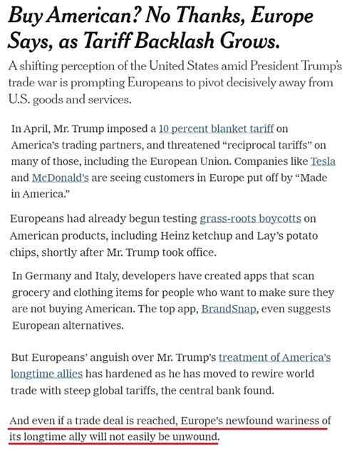 报道认为,由于本届美国政府对待盟友的方式给欧洲造成了不断加剧的痛苦,即使双方日后达成贸易协议,欧洲对美国新萌生的戒心也很难轻易消除。