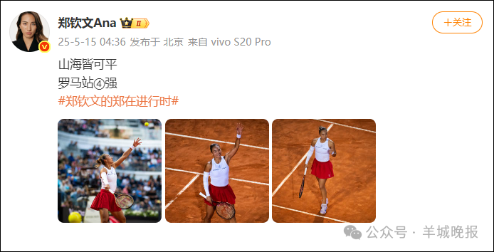 本场比赛赛后,郑钦文也在社交媒体发文:山海皆可平!