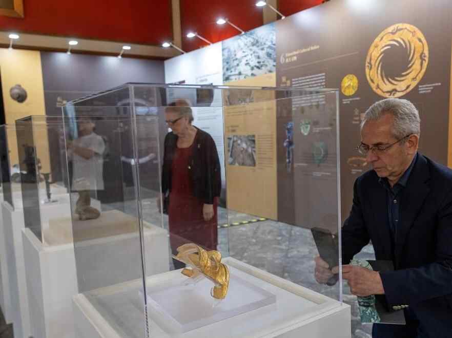 5月13日,人们在希腊雅典新斯米尔尼市政博物馆参观“青铜之光——古蜀文明特展”。