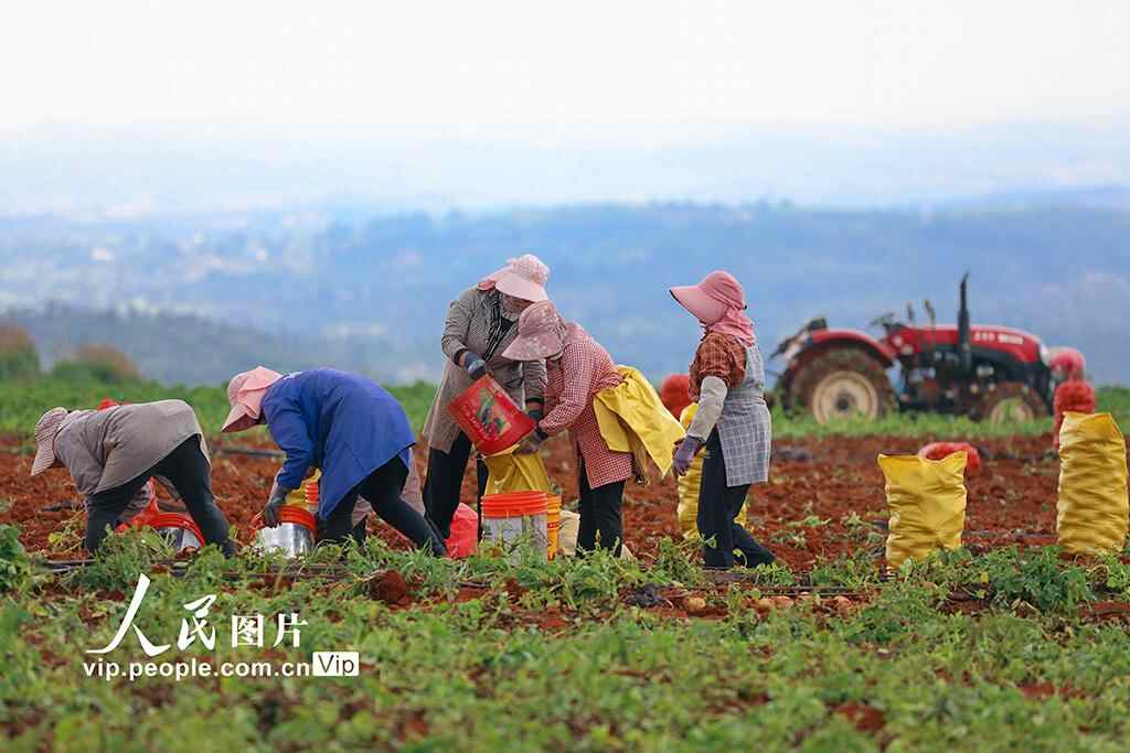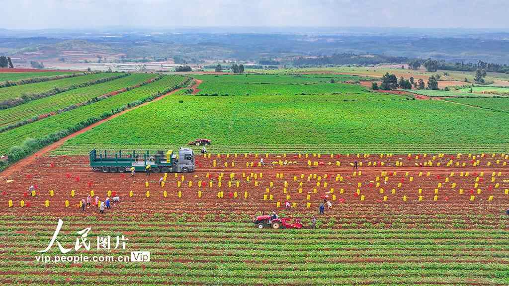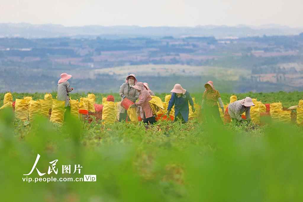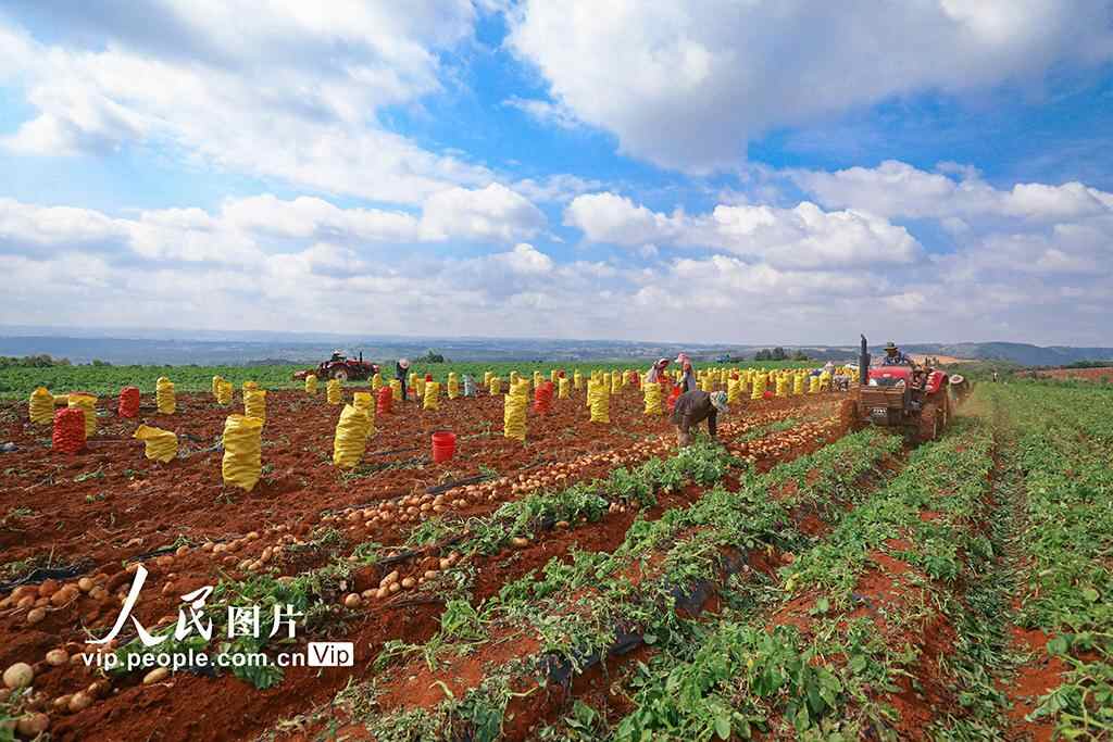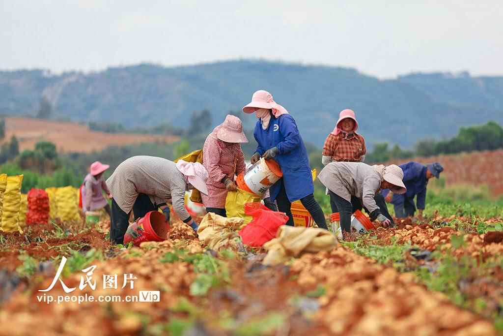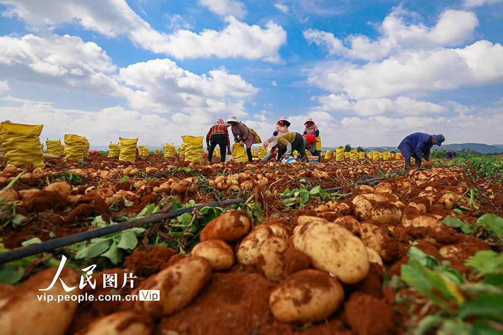 2025年5月14日,云南省曲靖市陆良县小百户镇普乐村的马铃薯种植基地里,农民在采收小春马铃薯。王勇摄(人民图片网)