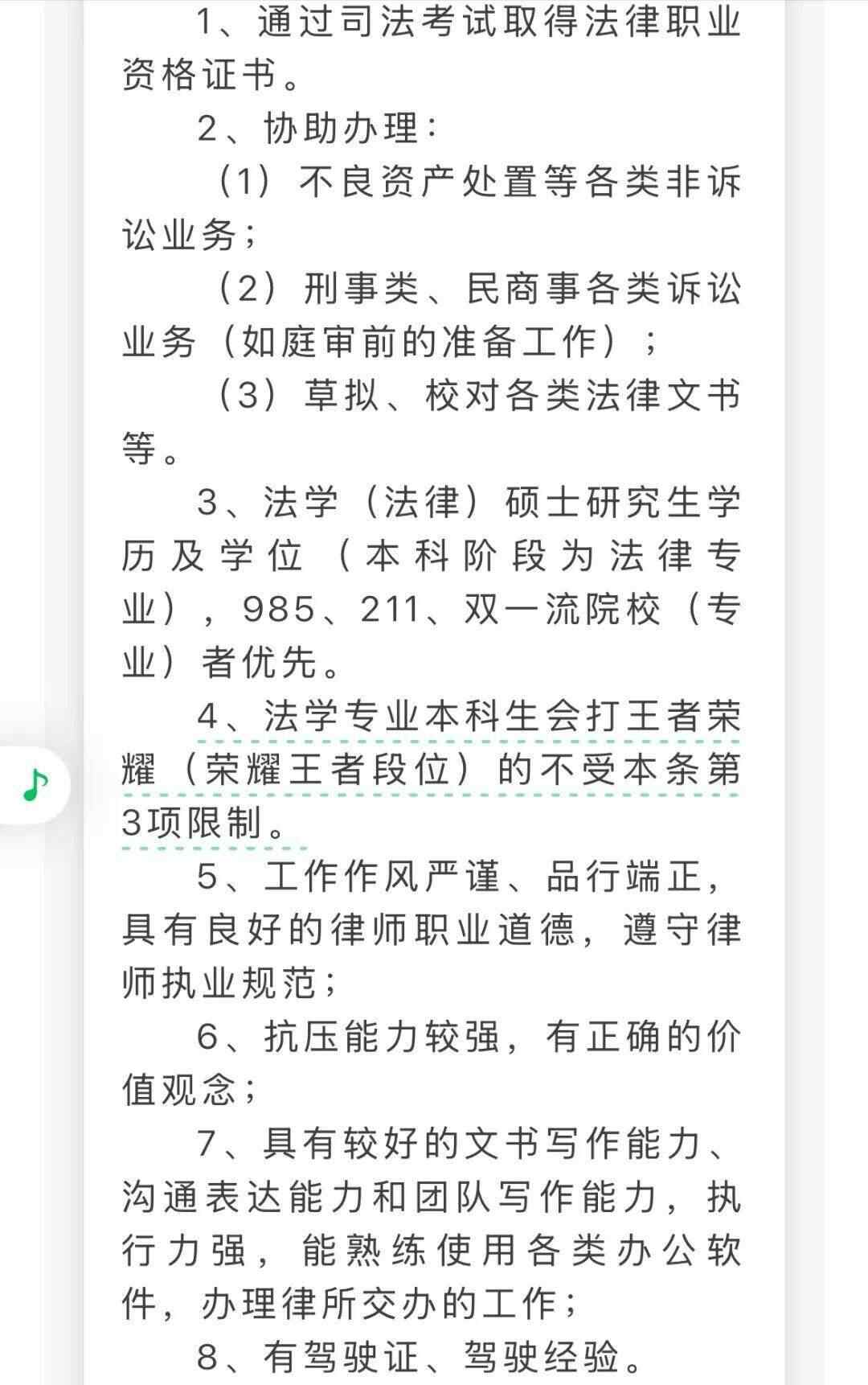 在招聘中,实习律师的岗位要求写道:3、法学(法律)硕士研究生学历及学位(本科阶段为法律专业),985、211、双一流院校(专业)者优先。4、法学专业本科生会打王者荣耀(荣耀王者段位)的不受本条第3项限制。