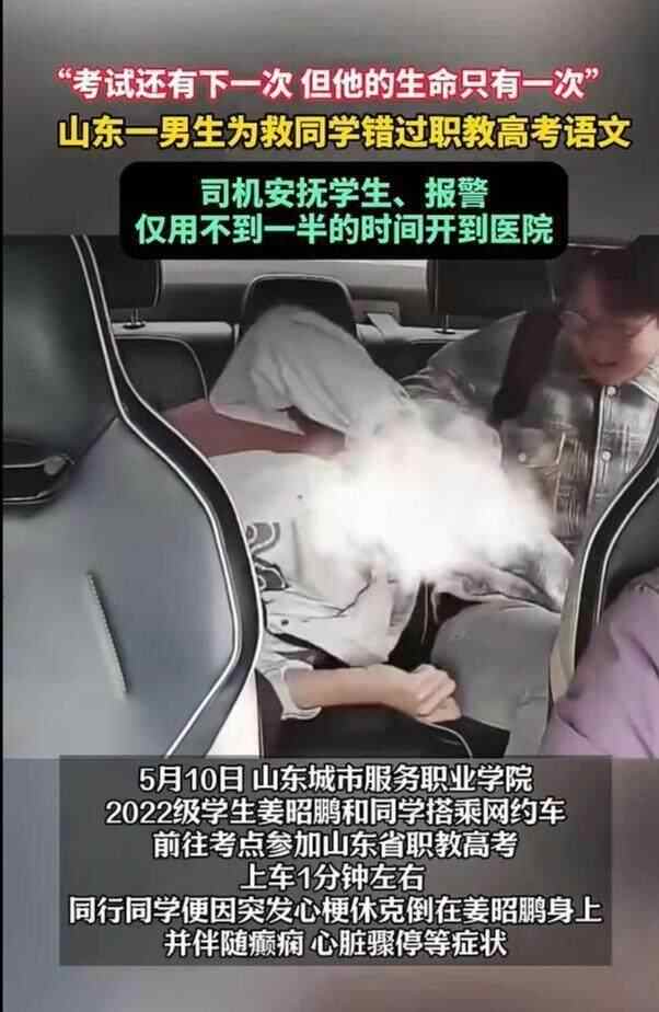 5月10日,山东烟台小伙姜昭鹏与同学乘车赶考途中同学突发疾病,他果断实施心肺复苏急救,并与网约车司机王涛一起将同学送医。姜昭鹏为救同学错过职教高考,令无数网友动容。