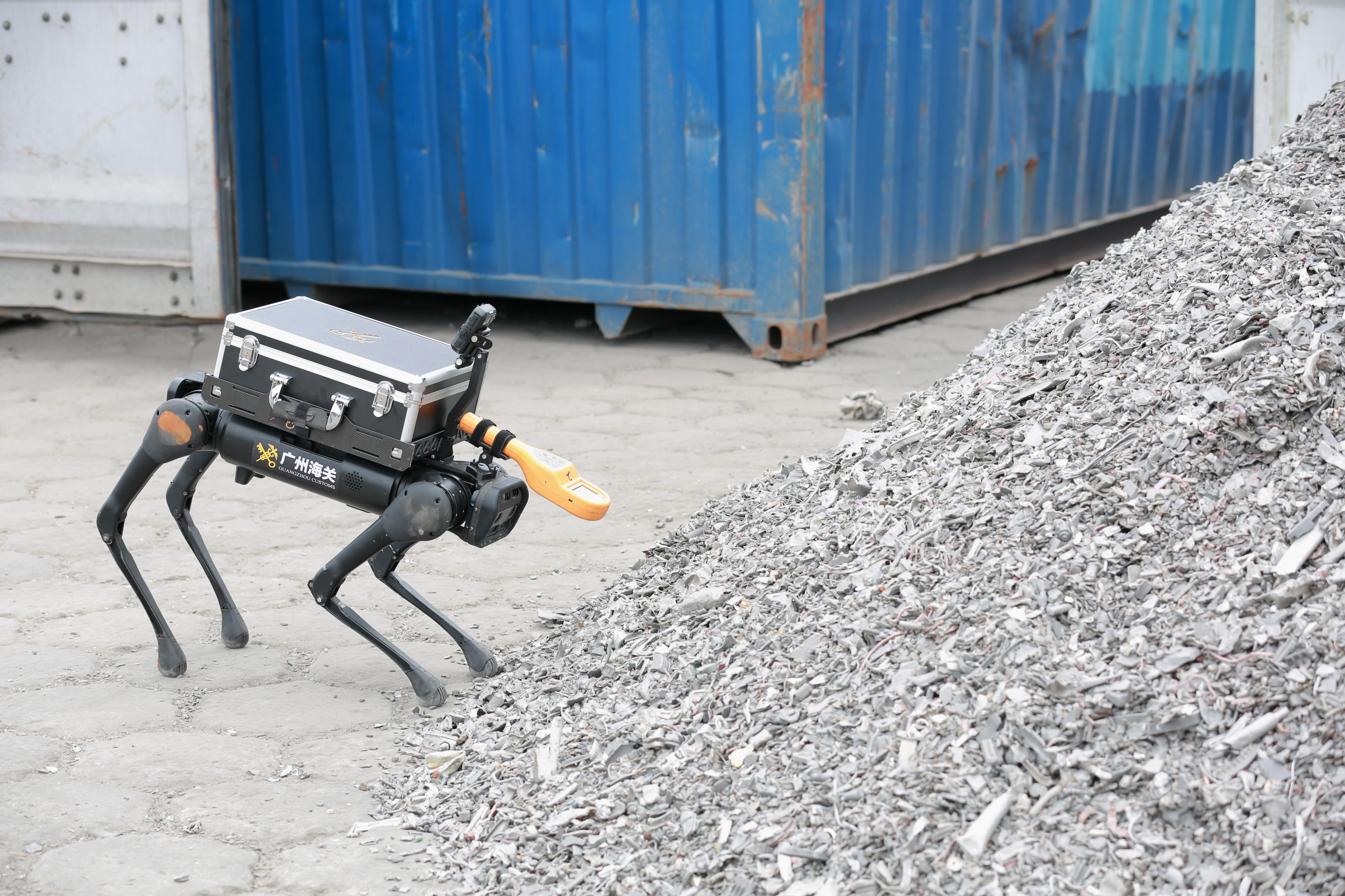 在佛山市高明区的珠江货运码头,一只“机器狗”正对一个触发放射性报警提示的进口集装箱实施放射性检测。只见它时不时停下来,用辐射探测传感器进行检测记录,这些数据将通过无线网络实时传输至指挥调度平台。在距离货物约20米的监管现场,广州海关所属佛山海关关员手持遥控器对“机器狗”进行操控,并查看“机器狗”实时回传的视频画面和检测数据。