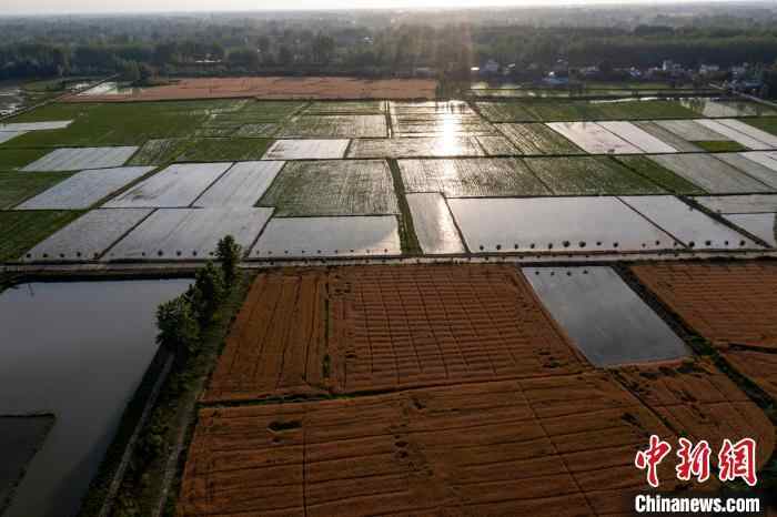 图为落日余晖中的稻田和麦田。(无人机照片)周旭 摄