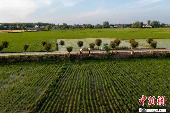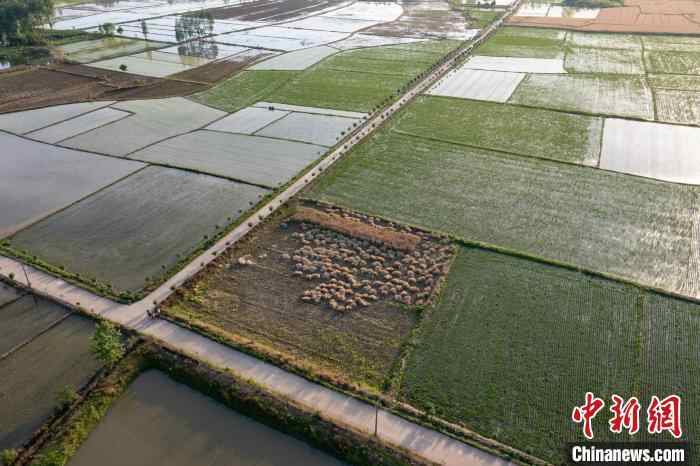 图为绿意盈盈的稻田。(无人机照片)周旭 摄